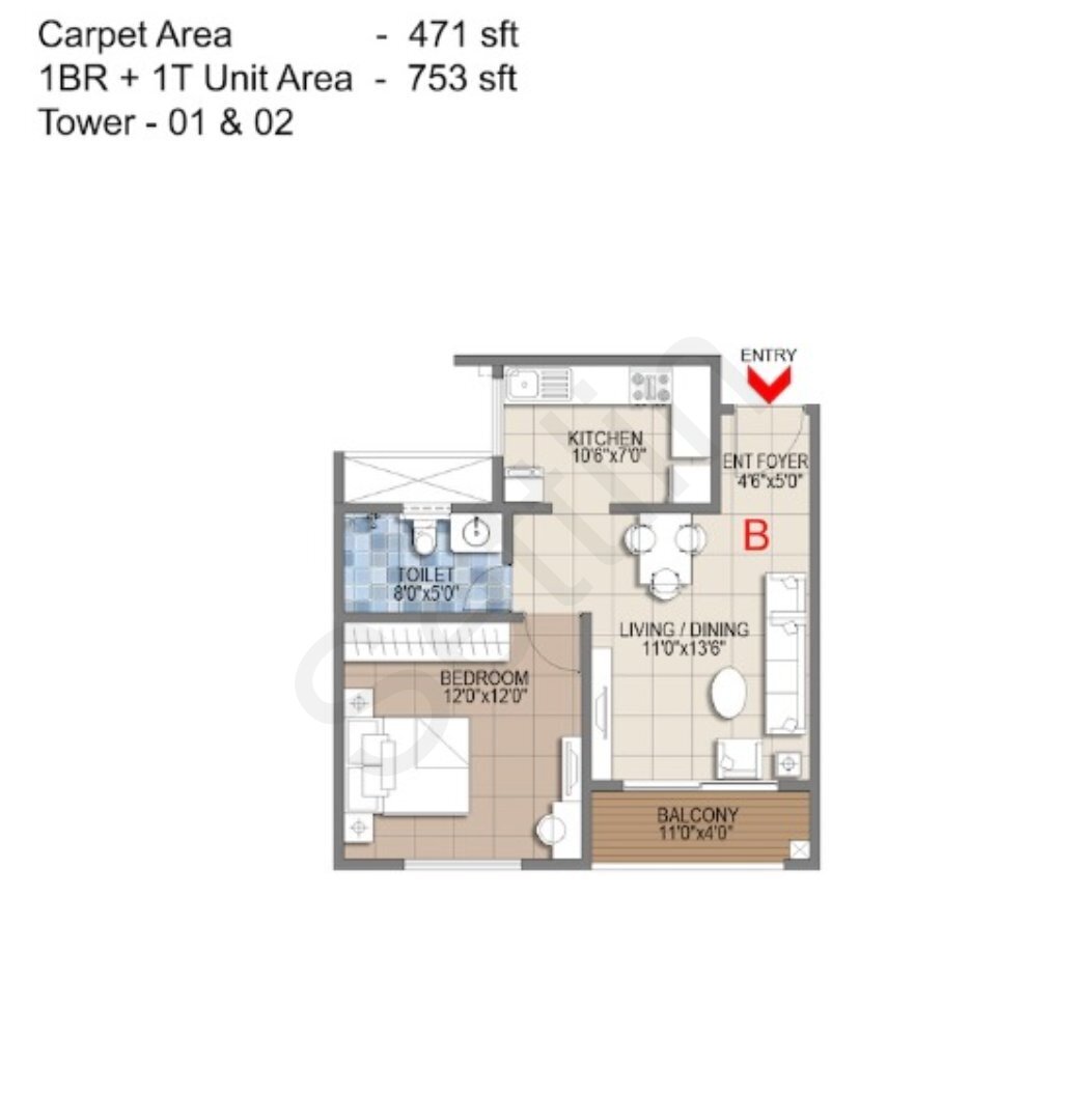 The listed size is 753 sq ft. Buyers should confirm the exact area definition being quoted, such as built-up, super built-up, or carpet area, before making comparisons.